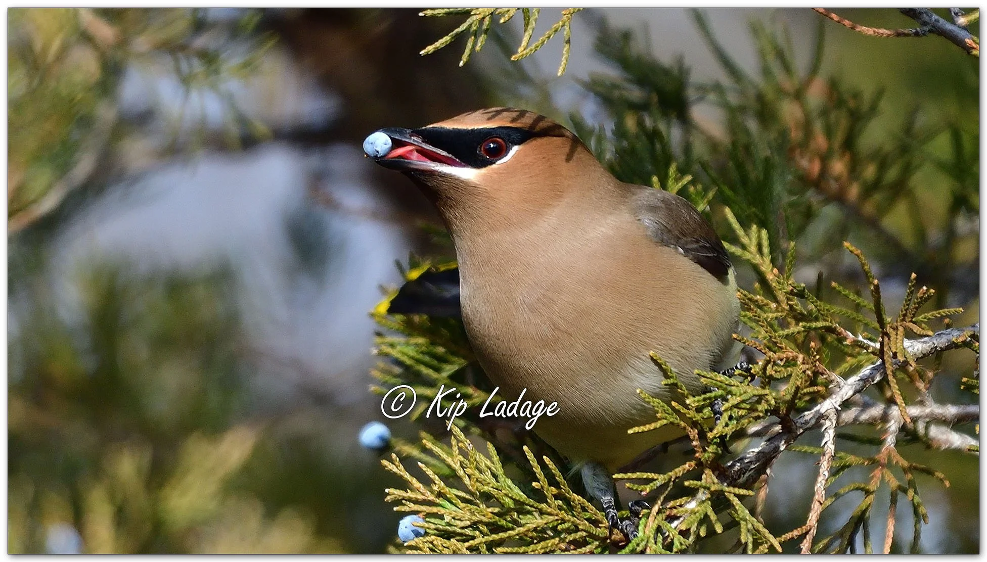 During a pleasant woodland walk I found two or three dozen cedar waxwings cleaning up on cedar berries. Much to my surprise, the birds had little fear of me, opting instead to gorge themselves on berries as I recorded image after image at close range. And to make the photoshoot even better, clouds broke enough for glimpses of blue sky to be included in some of the pictures. My time with the birds was much appreciated.