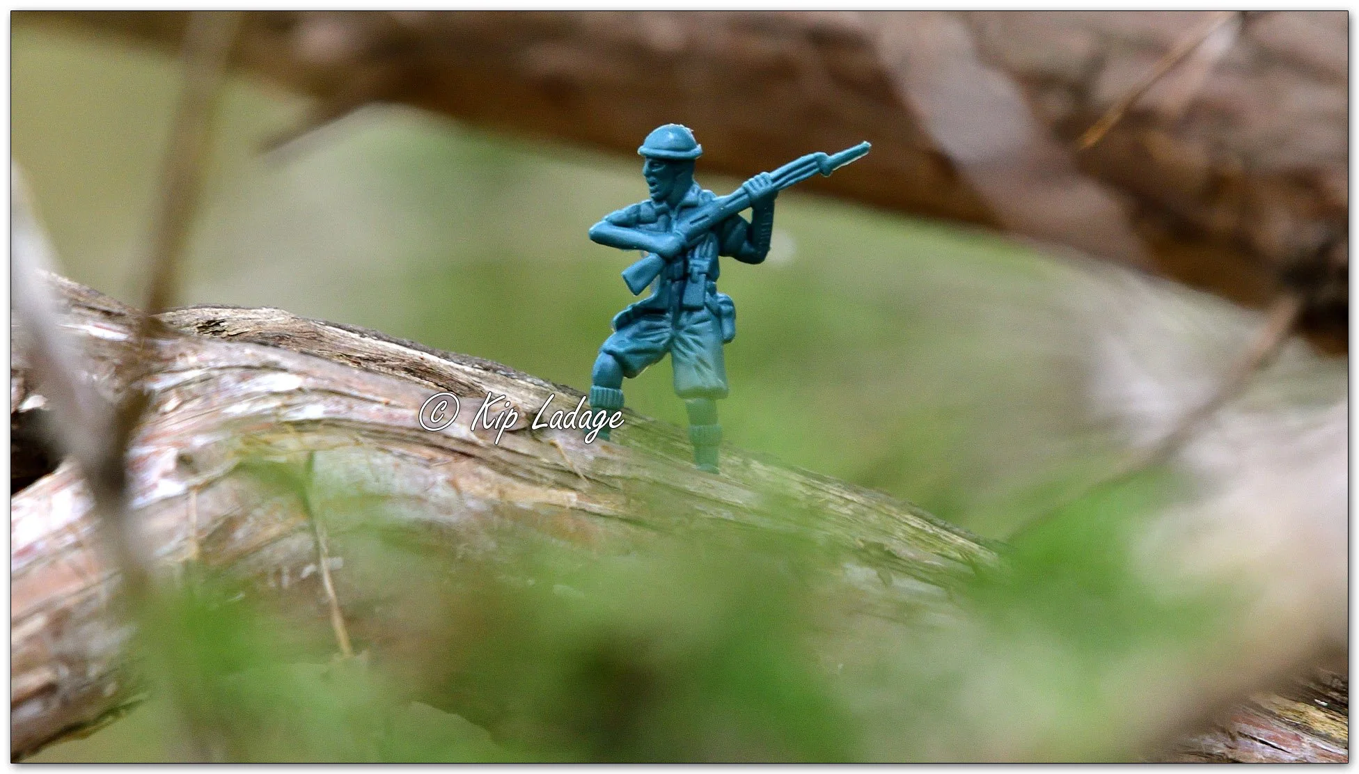 Finally, as I explored one cedar tree I spotted a small, weapon-packing soldier looking back at me. I wonder how this guy ended up where I found him and where he remains for others to find.