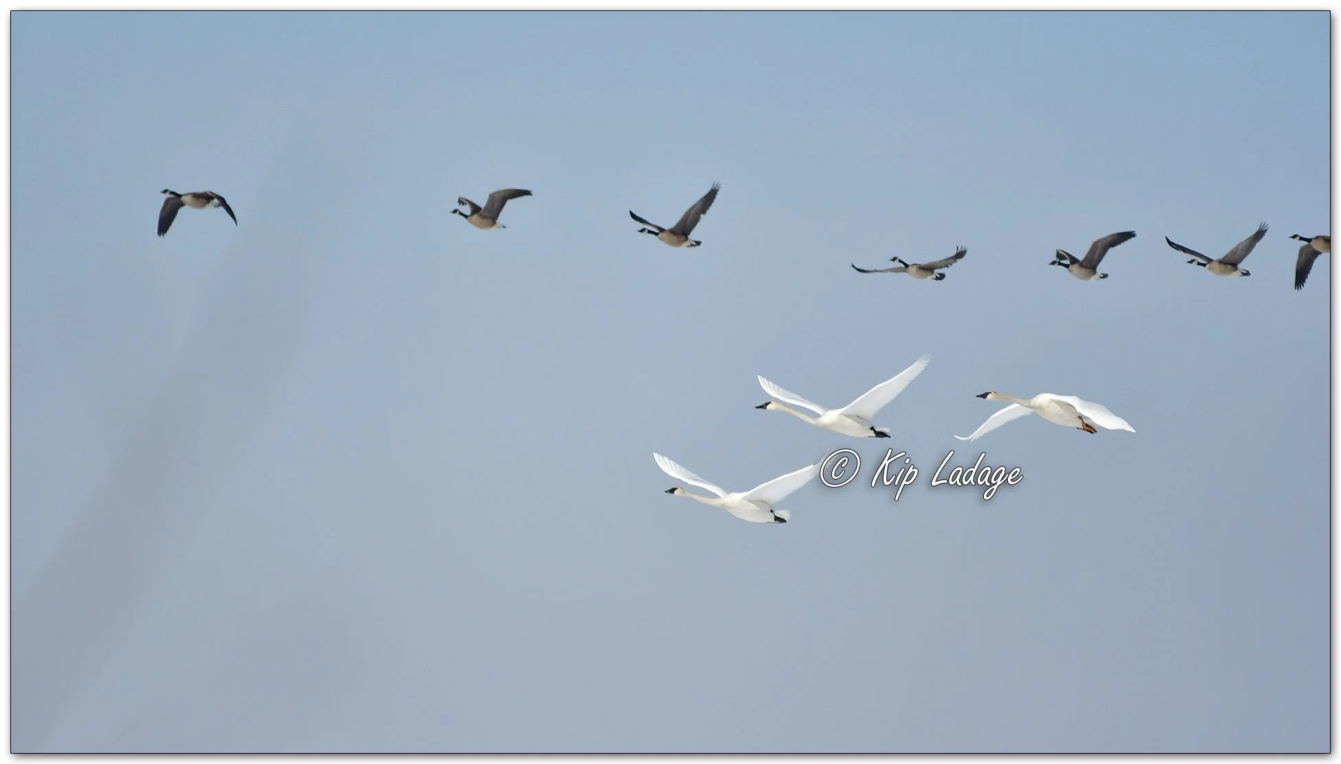 Minutes later I began a hike around Segment A of Sweet Marsh. As I approached the outlet of that pool, wave after wave of trumpeter swans flew overhead toward the open water and landed on ice nearby. I could only hope the swan outside of Segment A would join this mass of trumpeter swans.